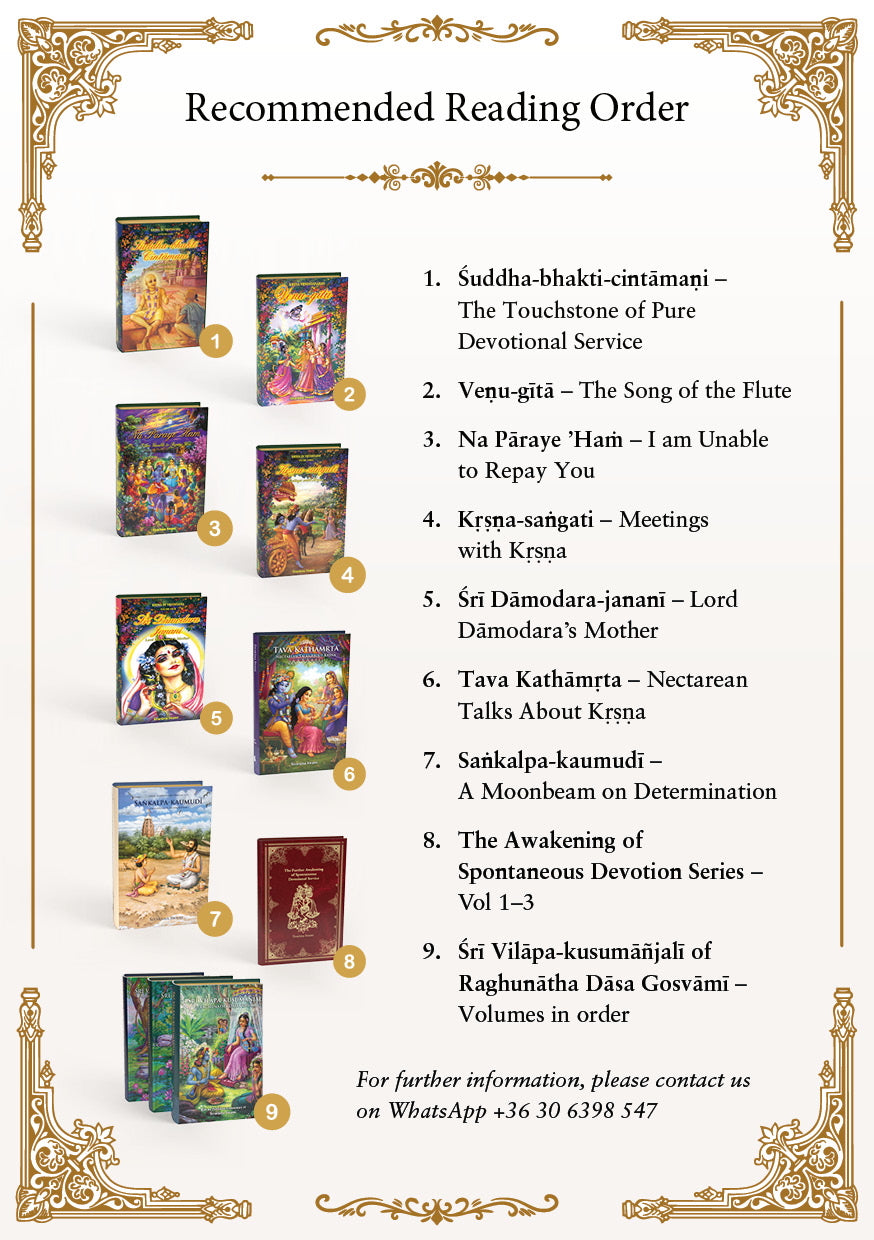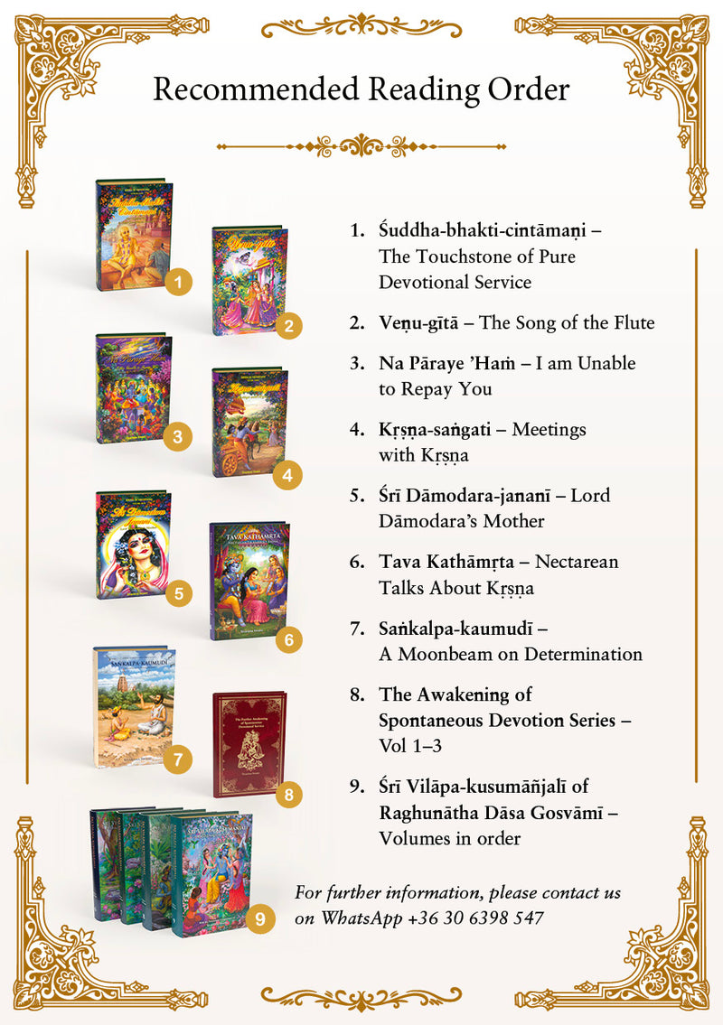 Hogy segítsünk az utadon, összeállítottunk egy ajánlott olvasmánylistát – útmutatót, amely lépésről lépésre bemutatja ezeket a kincseket: a Śuddha-bhakti-cintāmaṇival kezdve, egészen Raghunātha Dāsa Gosvāmī megindító imáiig a Śrī Vilāpa-kusumāñjaliban.